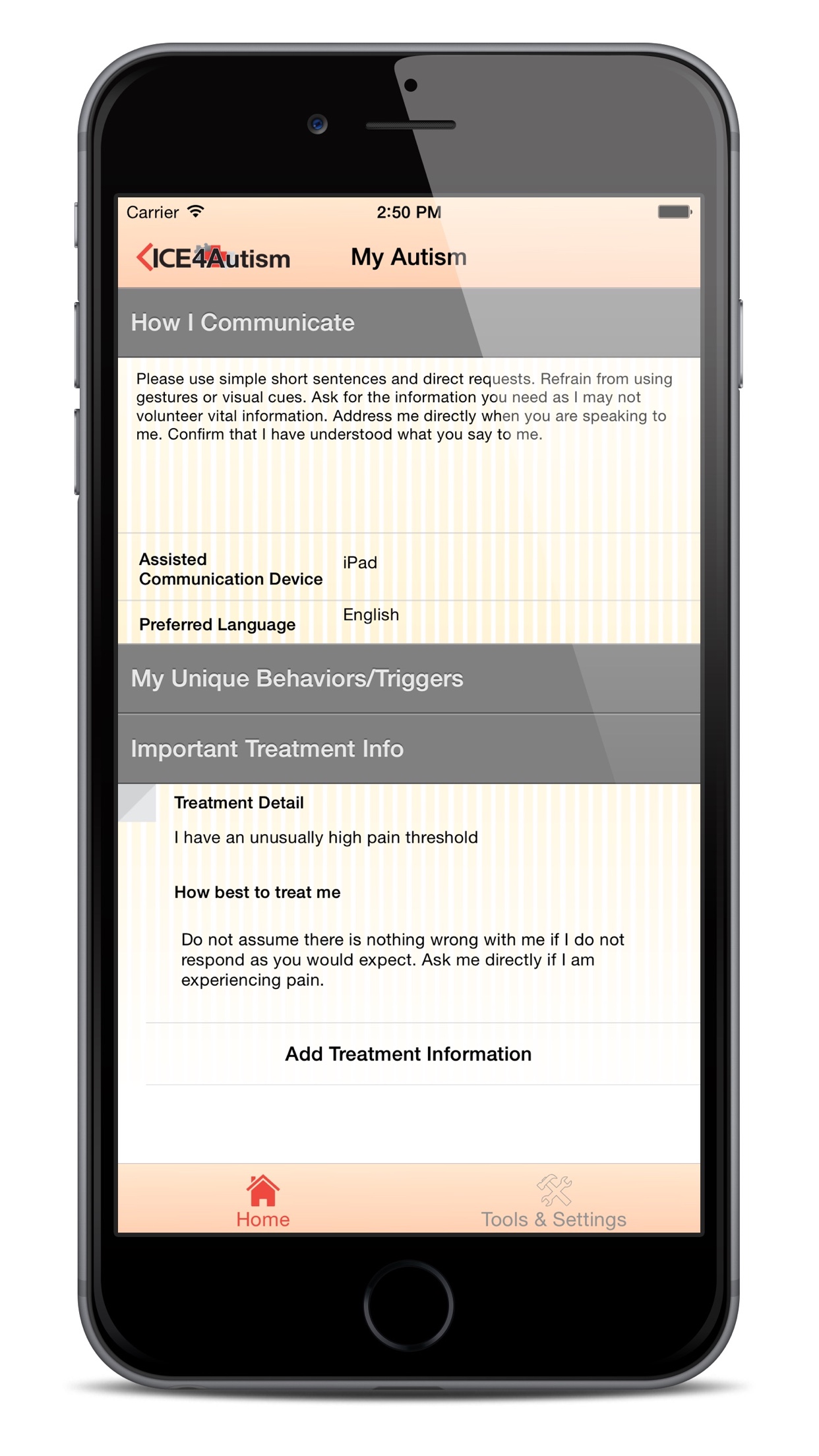 • My autism – including sub-sections for details about how the person communicates and prefers to be communicated with; any unique behaviors or triggers; and additional important treatment information